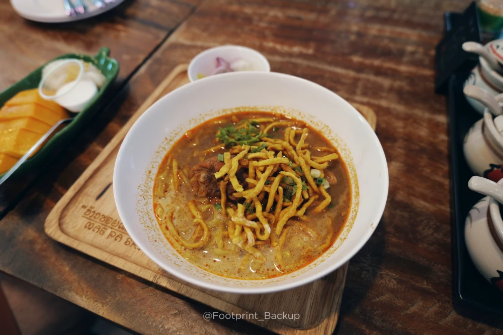 泰北獨有的咖哩金麵湯頭濃郁,雞腿軟嫩!口味不會到太辣,加上洋蔥提味~非常好吃。