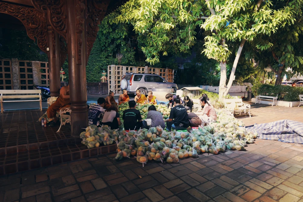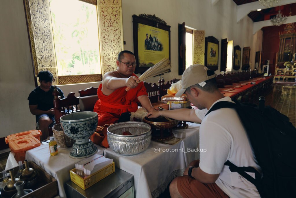 寺廟裡可以自由捐獻金額,讓僧人替你祈福,在泰國,僧人為信徒綁白色手繩(สายสิญจน์ sâai sìnj)是一種常見的祈福儀式,象徵保護、祝福和平安。