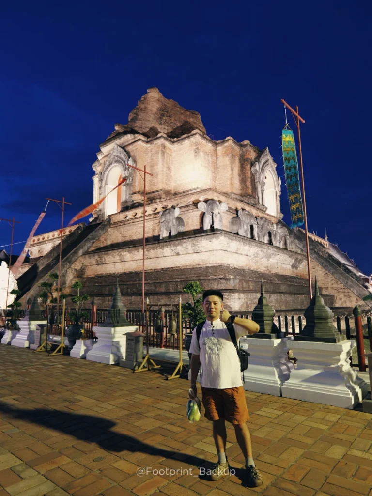 來訪時太陽已下山,清澈的深藍色的天空襯托著廟宇的輝煌、與在風中輕輕搖擺的旗幟「ตุง」(Tung)相呼應,現場體驗十分震撼。看著這座14世紀蓋的建築,好像掉進了時光隧道一樣,發呆了許久,柴迪隆寺絕對是清邁的必訪清單,這是我在古城內最喜歡的廟宇!因為住宿在寺廟附近我們經過好多次,白天和夜晚是完全不同的感受,很推薦大家晚上過來,更能體會歷史建築矗立在現代的滂薄。