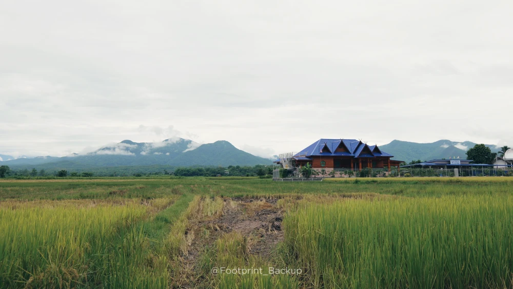 適逢雨季初,前往營地的路上已在下著時大時小的雨,大哥讓我們在路邊買了雨衣備用,也經過一家水果攤,大哥下去買了待會兒要給大象吃的西瓜,似乎有說參加的遊客也可以下去買,當時沒聽清楚……再接著驅車,來到一處遼闊的漂亮田園,被大哥趕下車來拍照🤣