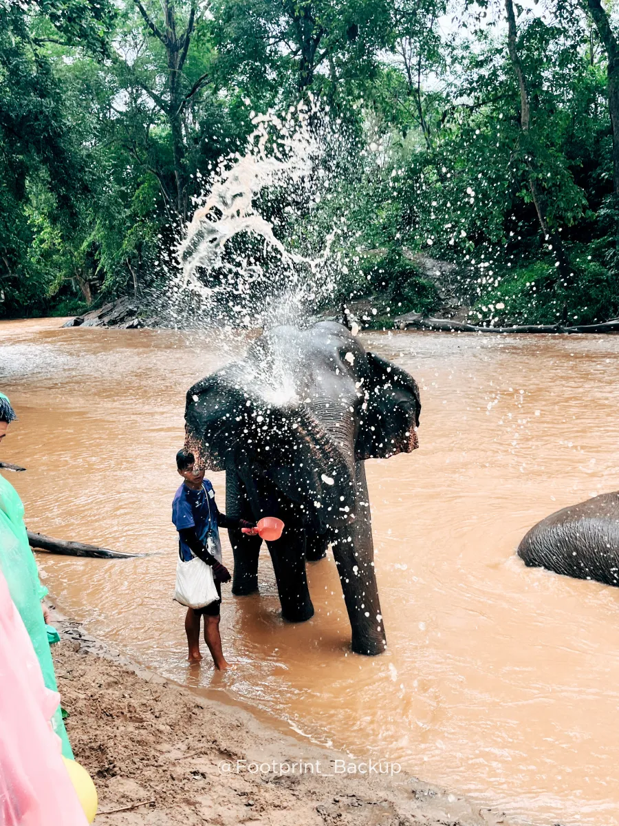工作人員會準備刷子和水盆,可以幫大象刷刷背,沖沖水,不過人類的手就這麼小一個,他們會找時間去磨牆壁、磨樹、磨地板😂至於大象會不會噴水除了個人意願外,也聽得懂工作人員的指示,就算沒有下雨,全身濕也是正常的,所以會建議多帶一套換穿的衣物。