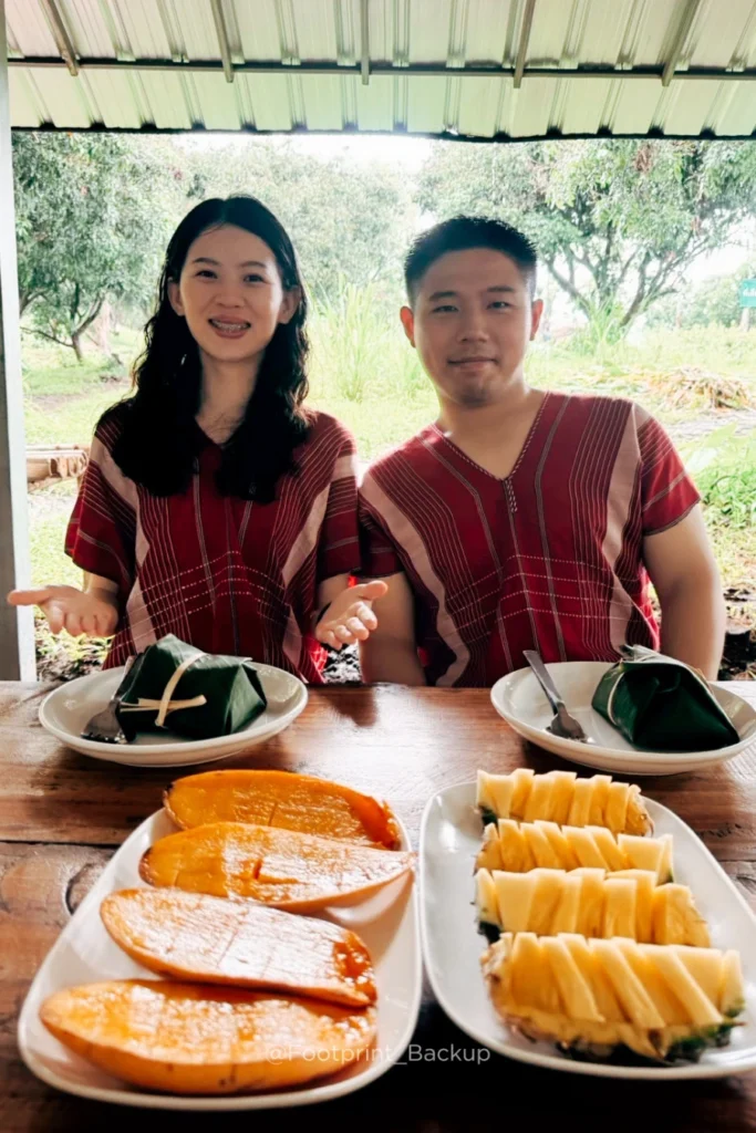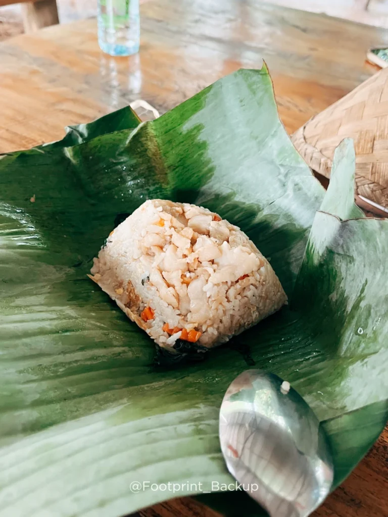 午餐提供水果和自製的「炒飯葉包」(Khao Pad Bai Tong / ข้าวผัดห่อใบตอง),簡單來說就是把普通炒飯(如肉絲、蛋、蔬菜)裝進香蕉葉裡,讓葉子的香氣滲進飯裡。