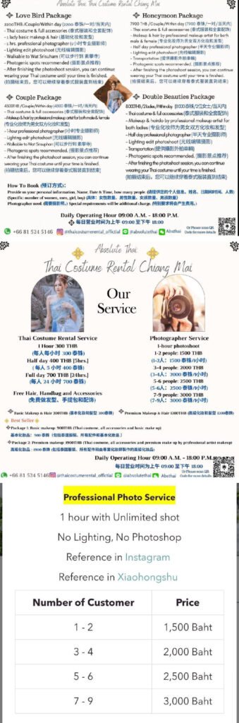 基本的服裝租借是一小時300泰銖,半日400泰銖,全日則為700泰銖。其餘妝髮及攝影服務有非~常多方案可以選,建議直接和店家要價目表!