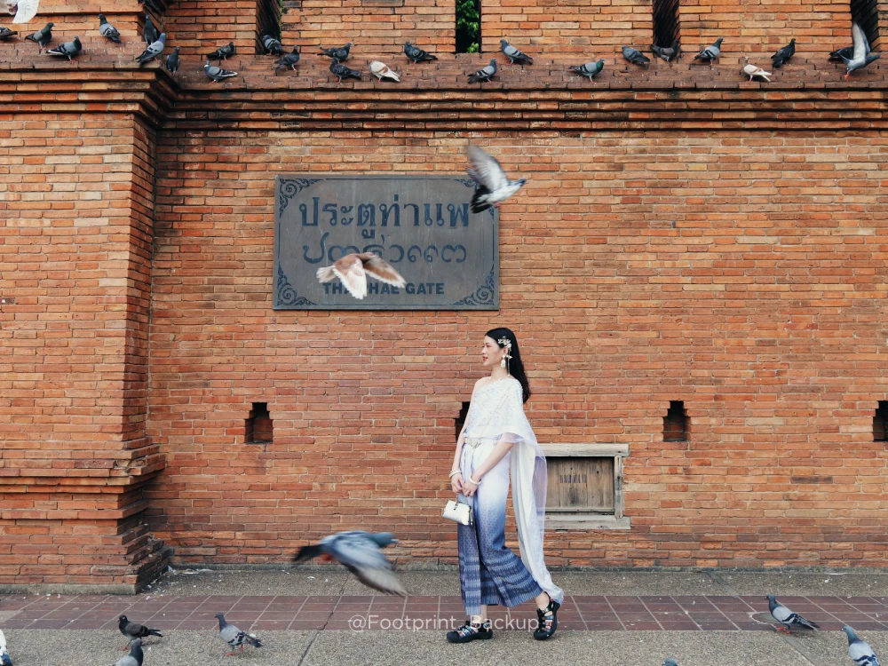 就是那個有很多鴿子的塔佩門~附近會有很多人來推銷,付費讓他們餵食鴿子,然後再嚇跑牠們,讓你拍出和鴿子共舞的照片,不過今年六月起(2025)泰國政府下令禁止再餵食鴿子,至於鴿子飛天照是不是真的成為絕響,嗯……不好說。
