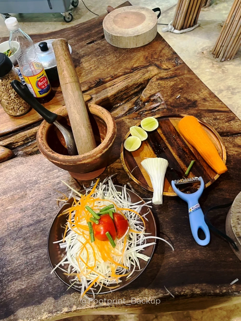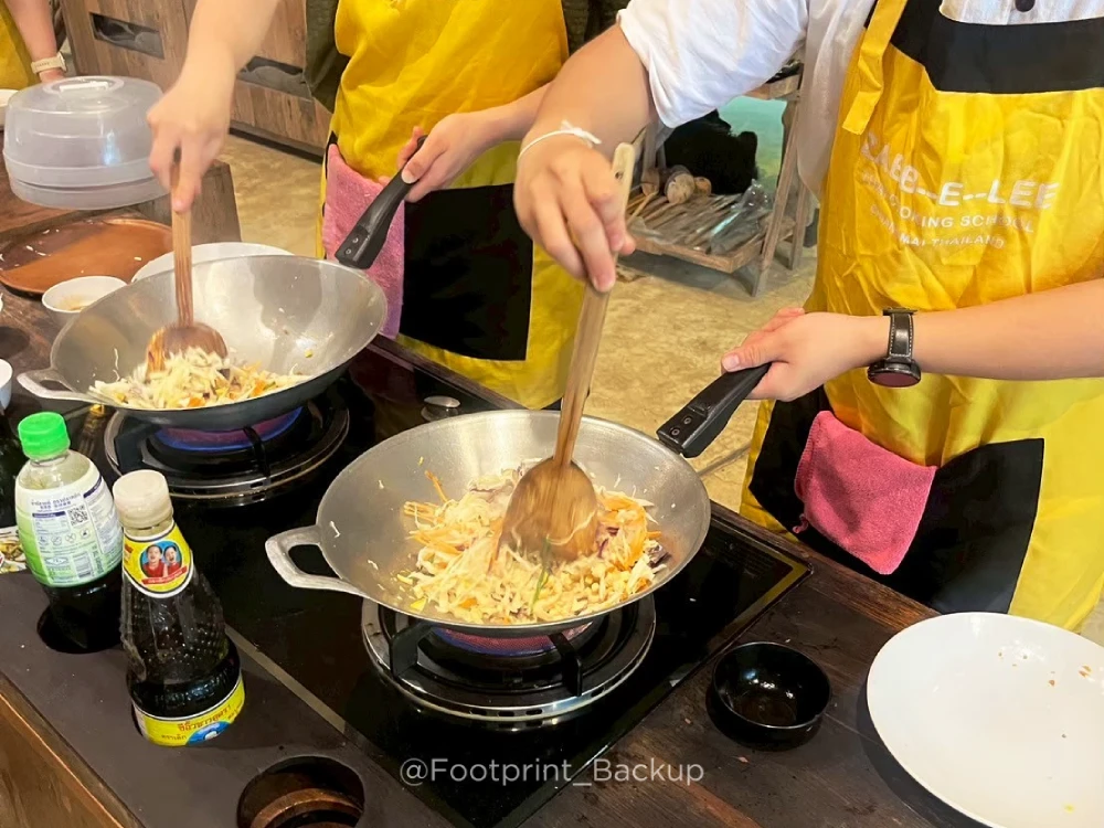 但是認真說,如果是衝著漂亮環境而去的,我建議只要報名一個人的做菜就好,另一個人陪同,課程規定沒有嚴謹到陪同者只能坐在旁邊發呆(畢竟陪同也是要600銖啊!),去湊湊熱鬧完全沒問題的!一來是有人可以幫忙拍照紀錄,二來是兩個人可以專注在一道菜上,像我們選了不同的菜色就是各忙各的沒有時間交流,加上一個人共五道菜的份量挺大,同學中沒有人全部吃完;三來,省錢!