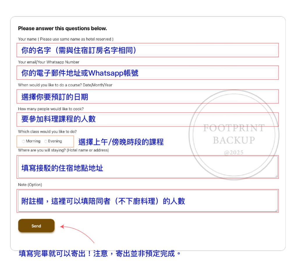 回傳信件可簡單回覆「Booking information confirmed」,也可以再次附上你的Whatsapp帳號,沒有也沒關係,這只是方便你和廚藝教室那裡的人聯絡和問問題。